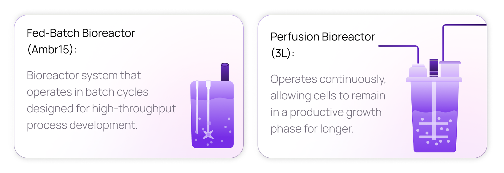 - Reduce experimental burden by virtually identifying and ranking clones in different bioreactor systems (FBR vs perfusion)