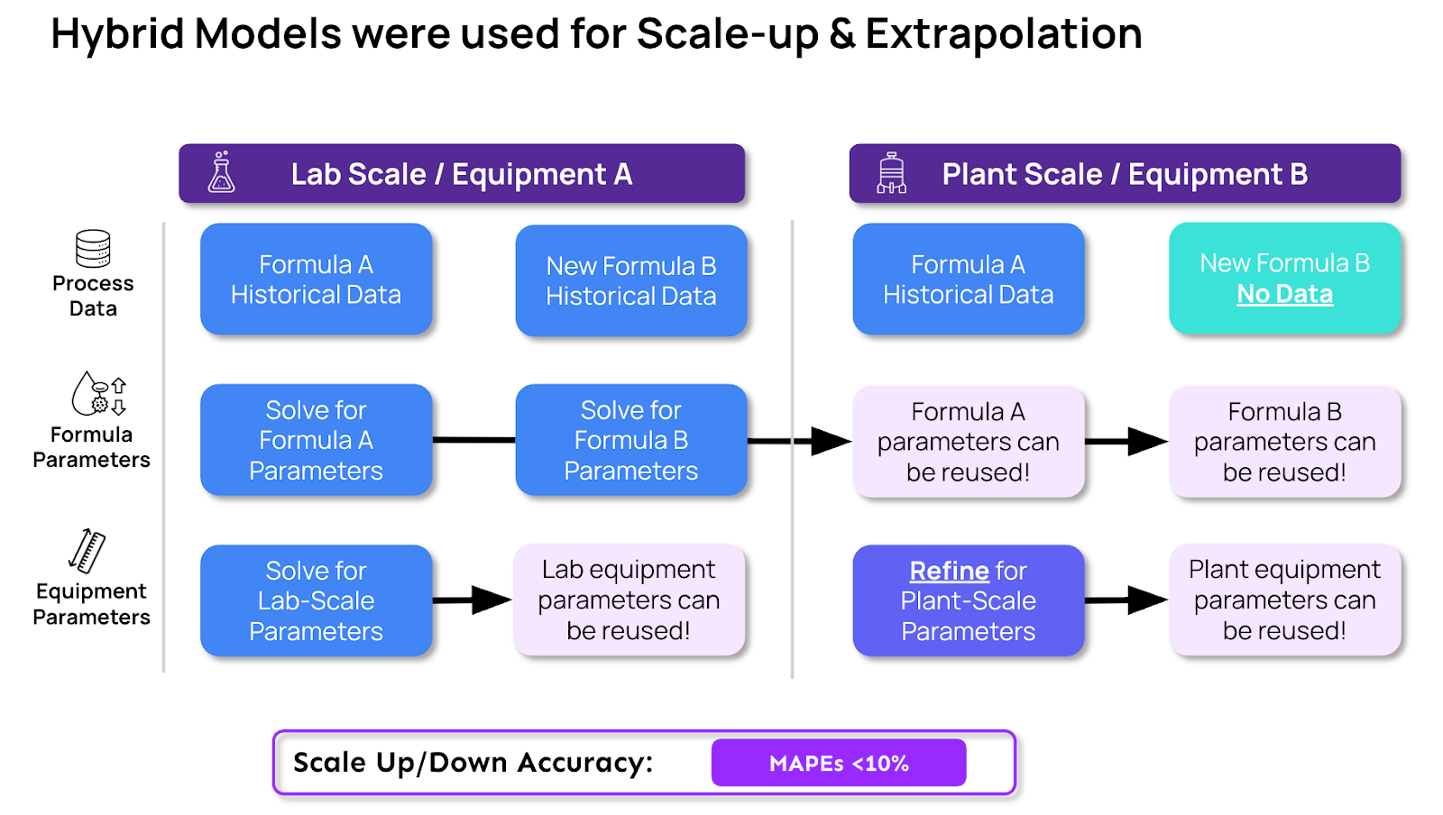 The approach begins with lab-scale data, where process parameters are solved for each formula individually.