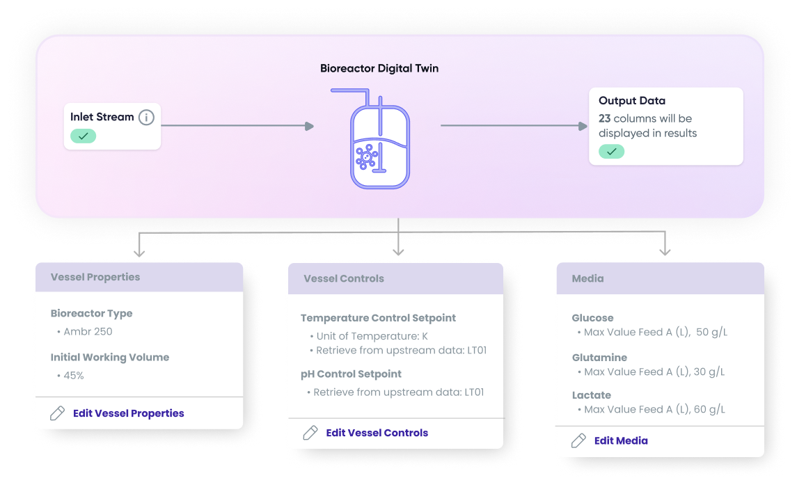- Simulation Modeling: A digital twin of the bioreactor was created to simulate the full production process under varying conditions. The team leveraged hybrid models to ensure the accuracy and reliability of the model, allowing the team to understand how factors such as temperature, pH, agitation speed, and nutrient feed influenced yield and quality without disrupting actual production.